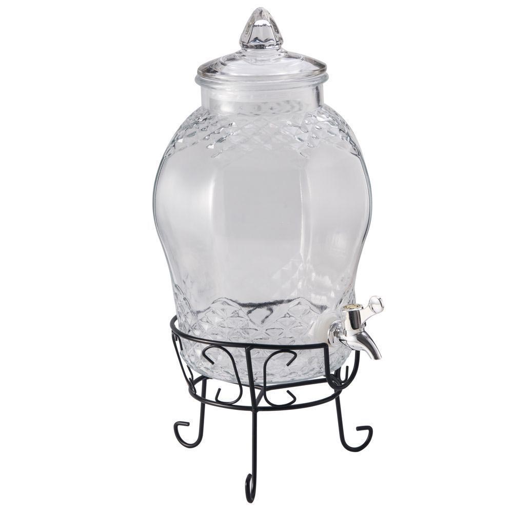 Емкость для напитков на подставке, выполненная из прочного стекла, оснащена крышкой и краном для выливания жидкости.