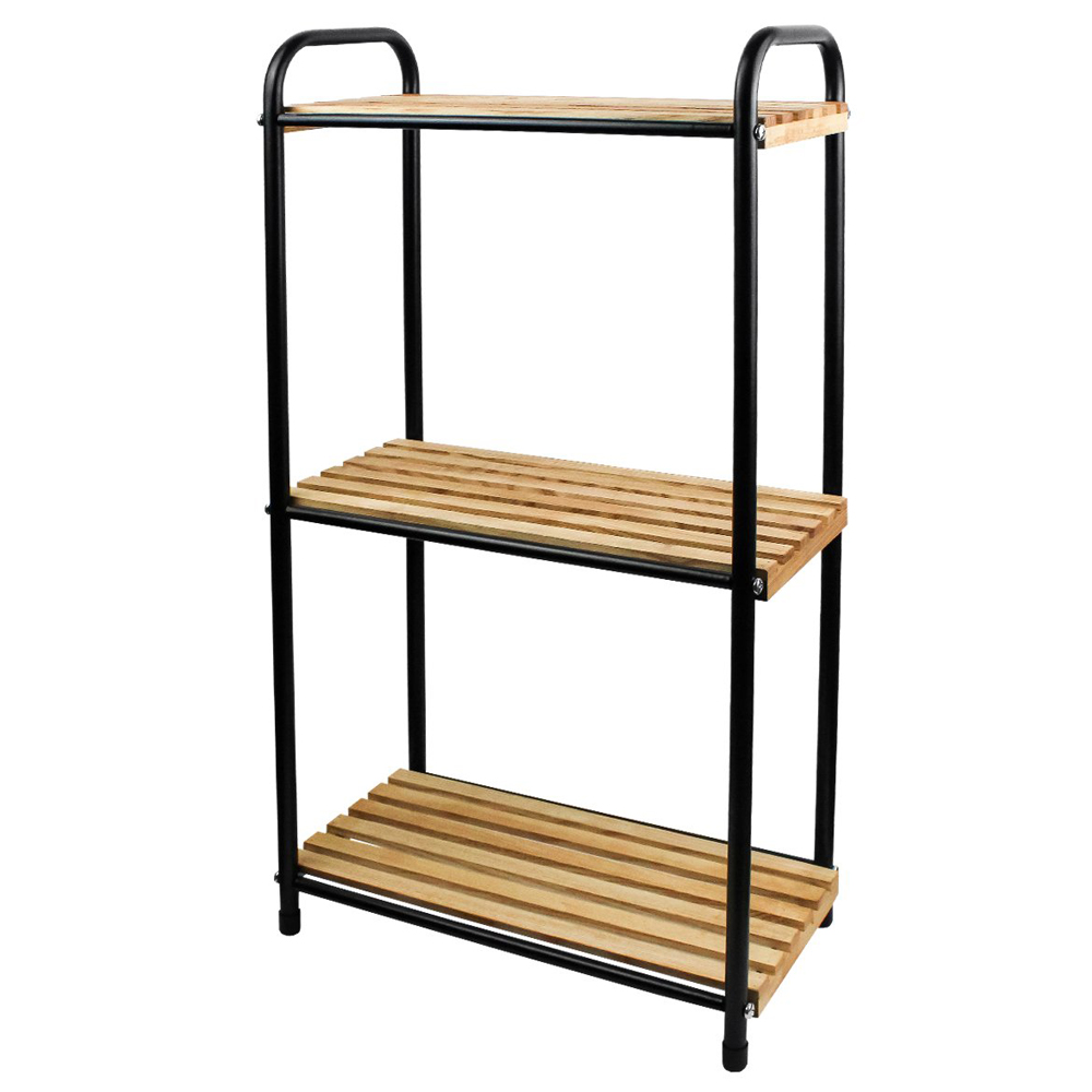 Стеллаж напольный в современный дизайне — это максимальная функциональность и прочность, идеальное решение для организации пространства на Вашей кухне и в ванной, в гостиной и на балконе, а также в любом другом помещении. Каркас выполнен из металла и окрашен в стойкую порошковую краску черного цвета, полки выполнены из натурального дерева. Влагостойкая пропитка полок позволит Вам использовать стеллаж в помещениях с повышенной влажностью. Этажерка для кухни состоит из 3 ярусов, очень удобная и компактная, но в тоже время вместительная, прекрасно впишется в пространство любой комнаты. Имеет оптимальное расстояние между полками (34 см) позволяет разместить все самые необходимые полезные в хозяйстве мелочи. Пластиковые наконечники на ножках предотвратят появление царапин на напольном покрытии. Устойчивая конструкция обеспечит безопасное использование. Изделие с легкостью собирается при помощи шуруповерта или отвертки. Саморезы для сборки идут в комплекте.