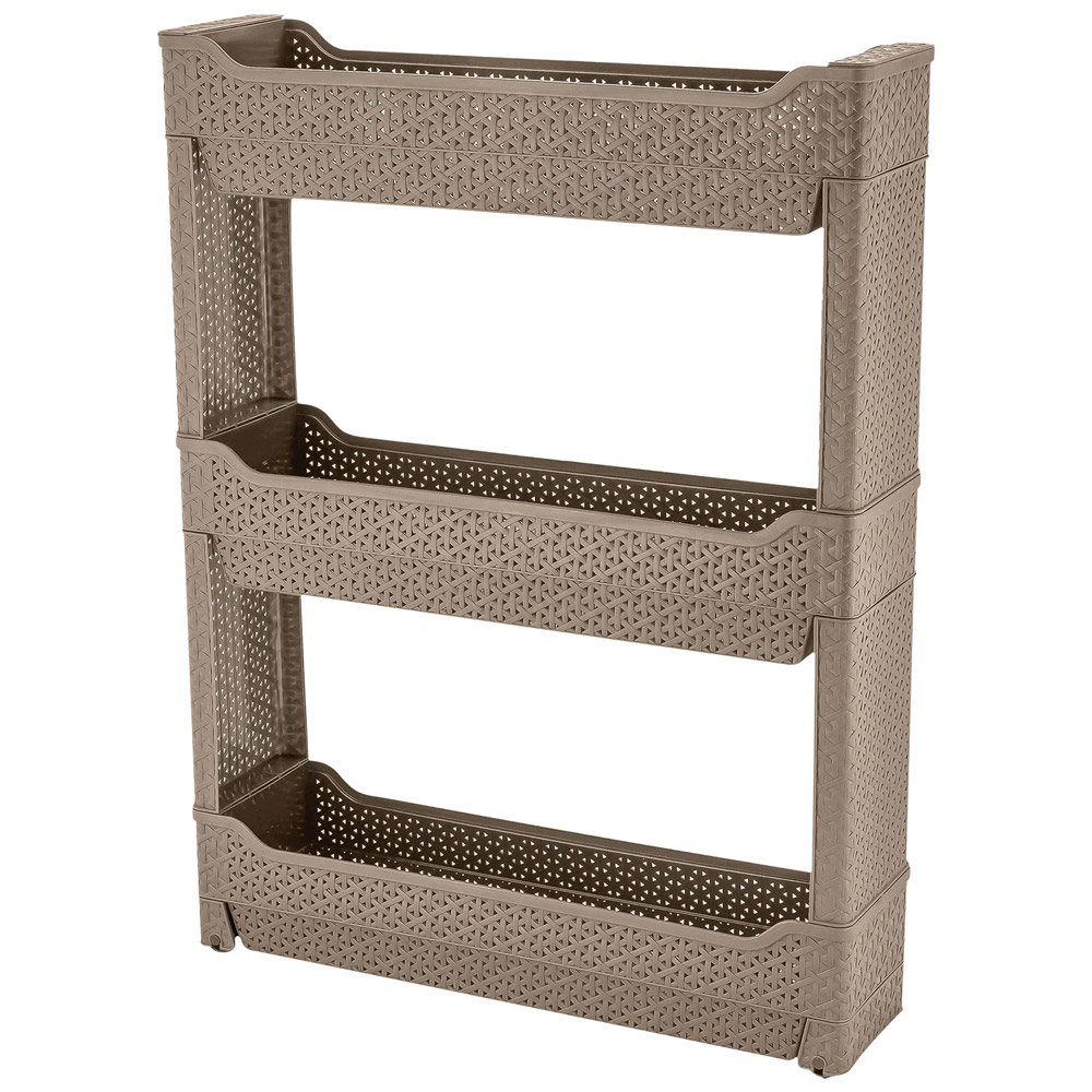 Этажерка универсальная 3-секционная "Wenge". Длинные полки с высокими бортиками позволяют бережно хранить различные предметы, а ролики в основании обеспечивают легкий доступ к содержимому при ограниченном пространстве – достаточно ее потянуть и выдвинуть или поставить обратно.