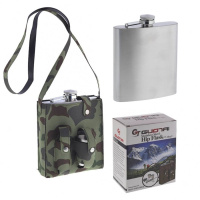 Набор из фляжки в чехле объемом 500 мл, 4 стопок, ножа. Фляга и стопки изготовлены из стали и сумка из лимерных материалов.