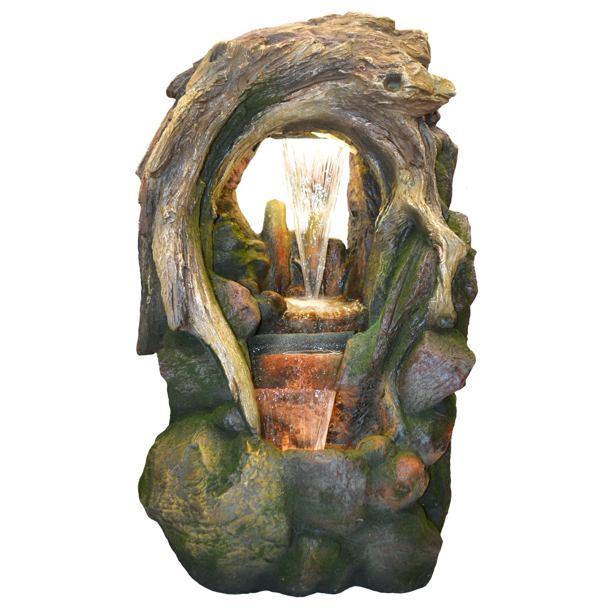 Фонтан изготовлен из полистоуна — искусственного камня, состоящего из акриловых смол и измельчённого натурального камня. Этот материал обладает рядом преимуществ: он прочный, устойчив к перепадам температур, не выделяет вредных веществ и прекрасно сочетается с другими материалами, такими как дерево и стекло.