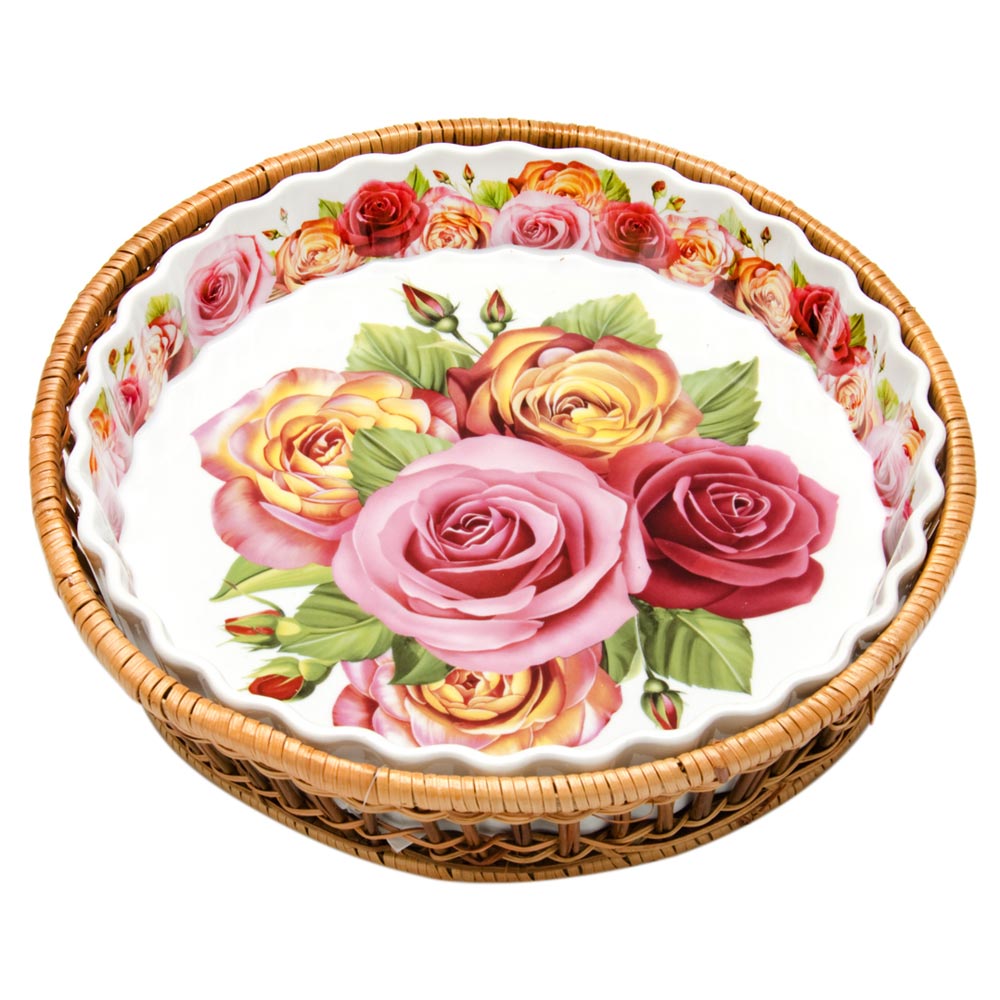 Круглая форма MAYER&BOCH выполнена из качественного фарфора белого цвета. Поверхность украшена изображением цветов. К форме прилагается плетеная корзинка из ротанга, выполняющая роль оригинальной подставки. Форма прекрасно подойдет для запекания овощей, мяса и других блюд, а благодаря своему оригинальному дизайну, она, несомненно, украсит ваш стол. Посуда не впитывает посторонние запахи, не имеет труднодоступных выступов или изгибов, которые накапливают грязь, и легко чистится.