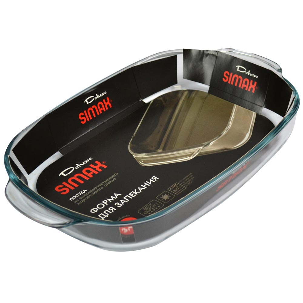 Форма для запекания из жаропрочного боросиликатного стекла. Данный материал безопасен для контакта с пищей, не содержит кадмий или свинец. Форму Simax можно использовать для приготовления, хранения, заморозки и сервировки пищи, выдерживают температуру от -40 до +300 °C. Подходит для использования в духовых печах, в СВЧ-печах, в холодильной и морозильной камерах, в посудомоечных машинах.