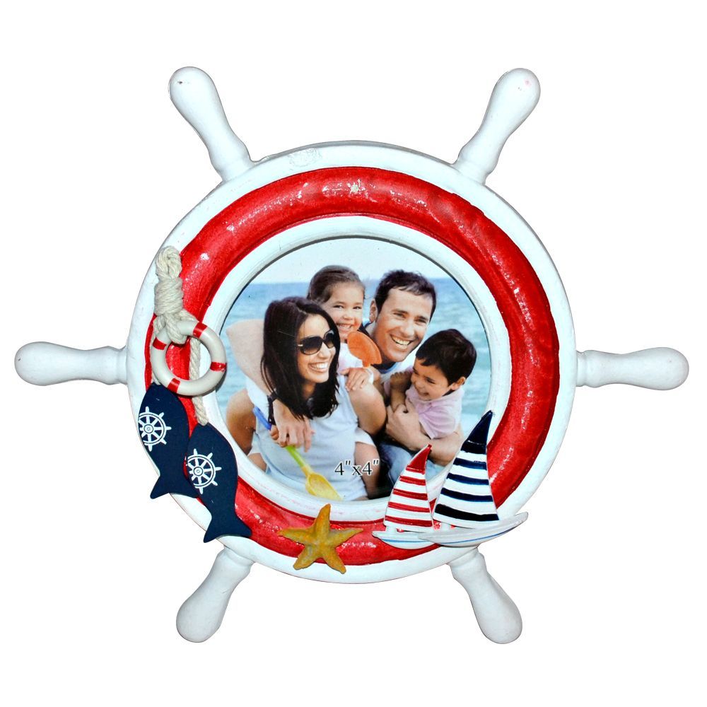 Рамка для фотографий, выполнена в виде штурвала из лакированного дерева с рисунком, включающим 2 лодочки, морских обитателей и спасательный круг.
