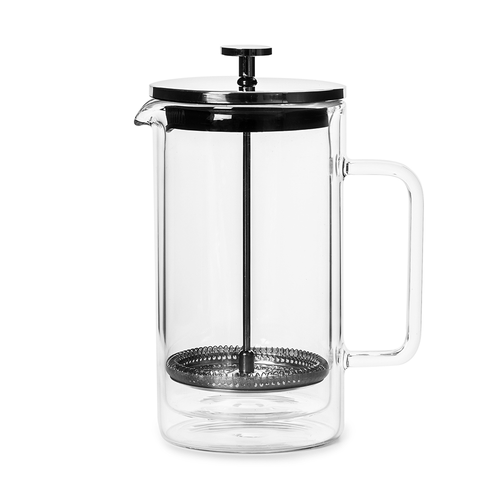 Френч-пресс DOUBLE WALL 1000 мл с аксессуарами — универсальное устройство для заваривания кофе, кофейных напитков, чая и травяных напитков. Френч пресс изготовлен из жаропрочного боросиликатного стекла и нержавеющей стали. Благодаря сетчатому фильтру мельчайшие чаинки, ягоды, кусочки фруктов, лепестки цветов и специи останутся в колбе, не попадут в кружку. Благодаря нижней подставке френч-пресс устойчив и не нагревает стол. Стеклянная ручка френч-пресса не нагревается и не обживает руки. Крышка надёжно фиксируется на чайнике, не позволяя напитку проливаться. Френч-пресс подойдет для заваривания чая и кофе как в горячем, так и холодном виде.