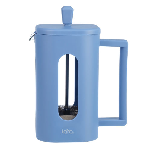 Оригинальный френч-пресс LARA с прямоугольным дизайном корпуса, защищающим стекло со всех сторон, станет отличным дополнением кухонного интерьера. Компактный и удобный аксессуар поможет быстро приготовить любимый напиток. Достаточно вскипятить воду, залить ее в чай или кофе, нажать пресс и отделить гущу от основного напитка. Просто и быстро. При производстве мы использовали экологически чистые материалы. Прямоугольная колба из жаропрочного боросиликатного стекла выдерживает высокую температуру. Корпус, крышка и ручки выполнены из пластика синего цвета. Плунжер и сетчатый фильтр изготовлены из пищевой нержавеющей стали AISI304.
