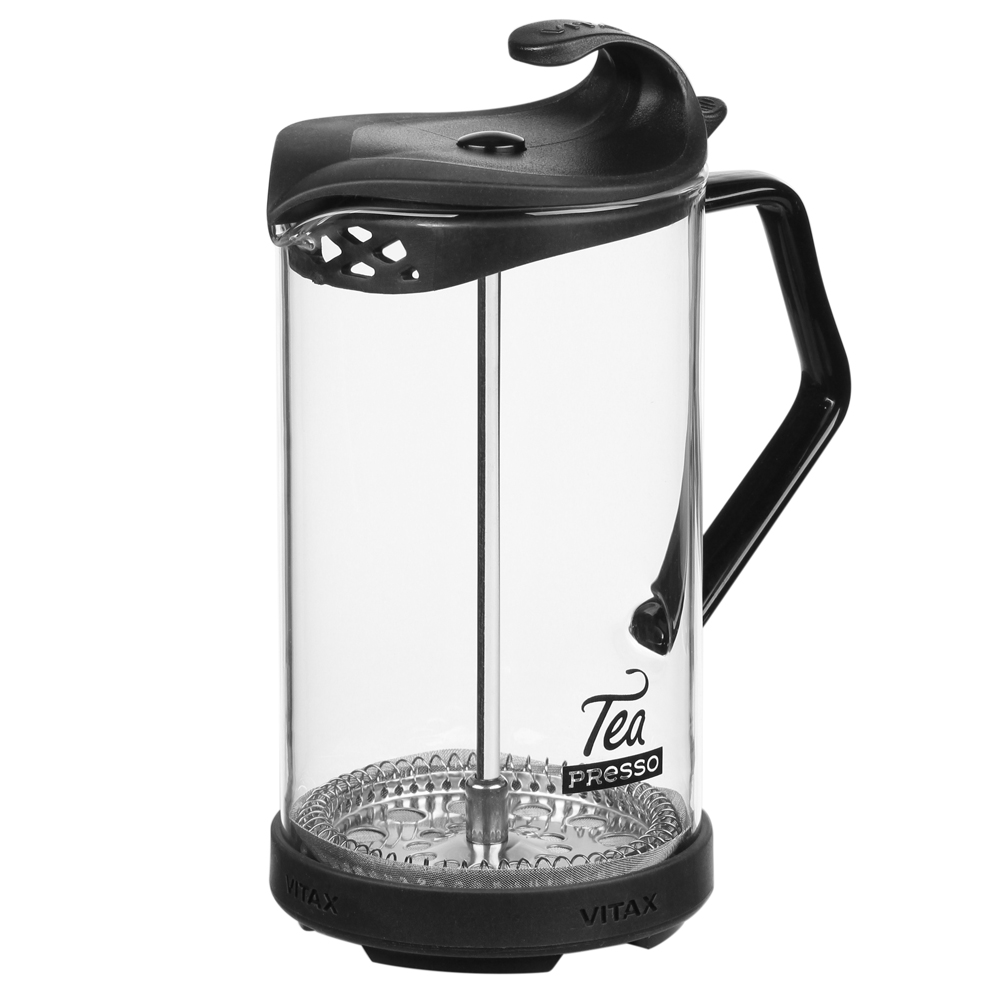 Френч-пресс Vitax Tea presso. Корпус из высококачественного, особо прочного, термостойкого боросиликатного стекла; поршень и фильтр изготовлены из высококачественной пищевой нержавеющей стали 18/10. Термо-сберегающая крышка из двухкомпонентного пластика и силикона высокого качества, съёмное защитное дно из термостойкого силикона. Подходит для мытья в ПММ.