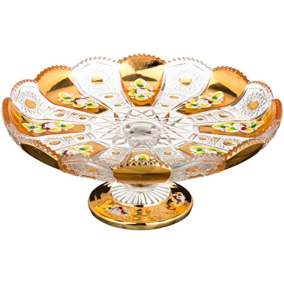 Фруктовница на ножке от бренда Lenardi выполнена из стекла, декорирована золотом и резным узором.