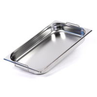 Изготовлены из высококачественной нержавеющей стали 18/10. Толщина стенок - 0,8 мм. Такие гастроемкости прекрасно подходят для использования в пароконвектоматах и конвекционных печах. Благодаря ручкам гастроемкости удобно помещать и извлекать из салат-баров, мармитов. Устойчивы к образованию вмятин, гастроемкости не "ведет" при высокой температуре.