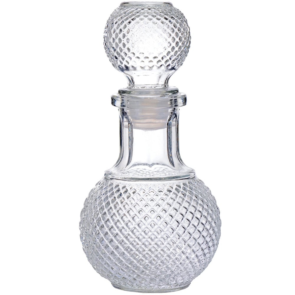 Элегантный дизайн изделия украсит собой любой праздничный стол, в таком штофе Вы сможете подать вино, морс, различные наливки и ликеры, цвет которых будет играть, преломляясь через рельефные внешние грани штофа.