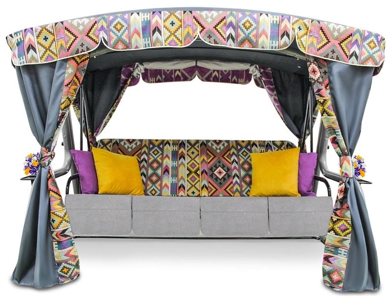 Классический восточный орнамент в сочетании со строгим стальным цветом обивки дивана делают эту модель качелей уникальной в своем роде. Она естественным образом впишется в любой уголок вашего сада и станет его логичным продолжением. Четырехместный диван легко вместит дружную компанию и раскладывается в полноценную кровать. Вы можете выбрать самое комфортное положение с помощью подъемных подголовников, а плотная антимоскитная сетка не позволит насекомым нарушить ваш покой.