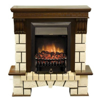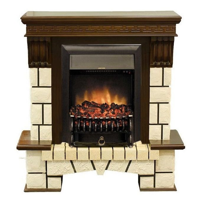 Каменный портал Real Flame Stone new STD/EUG AO с очагом Fobos s Lux BL/BR имитирует белую кирпичные колонны, накрытые массивной полкой. Полка отделана темно-коричневым натуральным шпоном. Внешний вид демонстрирует красоту обрамления для декоративного очага.