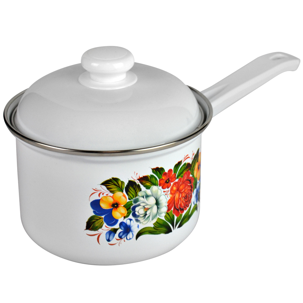 На корпусе изделия очень удобная длинная пластмассовая ручка (не съемная). Крышка с пластмассовой ручкой. Двойной слой эмалевого покрытия. Нержавеющий ободок по краю кастрюли и крышки.