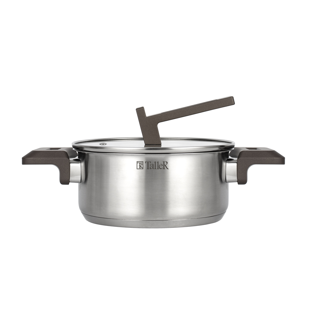 Ручки из бакелита и нержавеющей стали, крепление ручек - точечная сварка. Цвет ручек - коричневый. Материал крышки - высококачественная нержавеющая сталь и жаропрочное стекло. Крышка имеет плоское закаленное стекло и отверстие для выхода пара. Уникальная конструкции ручки позволяет установить крышку на кастрюлю во время приготовления пищи.
