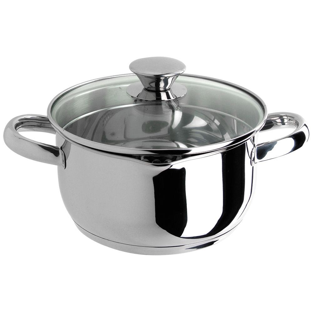 Кастрюля из нержавеющей стали, капсулированное дно, крышка стекло с пароотводом.