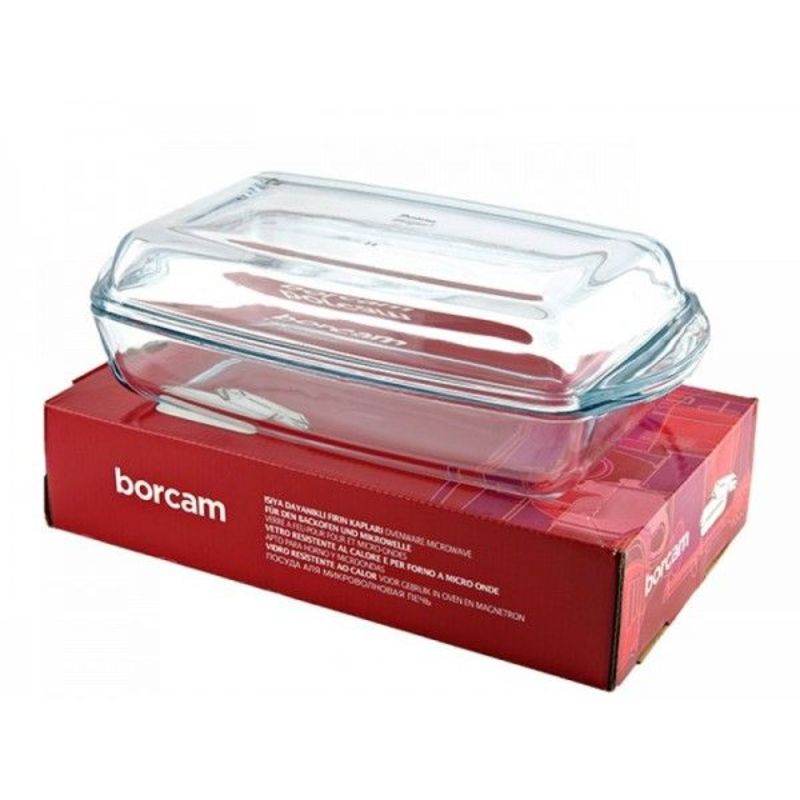 Прямоугольная стеклянная форма Borcam 59010 для запекания с крышкой. По бокам изделия расположены выступающие ушки. Крышка и форма изготовлены из закаленного термостойкого стекла, которое выдерживает от - 40°C до 300°C и подходит для приготовления блюд в духовке, микроволновой печи, аэрогриле.