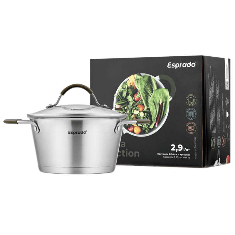 Кастрюля с крышкой Esprado Olivera размером 20х11 cм из высококачественной нержавеющей стали #304 с крышкой из термостойкого стекла и с cиликоновыми ручками. Объём: 2,9 л.