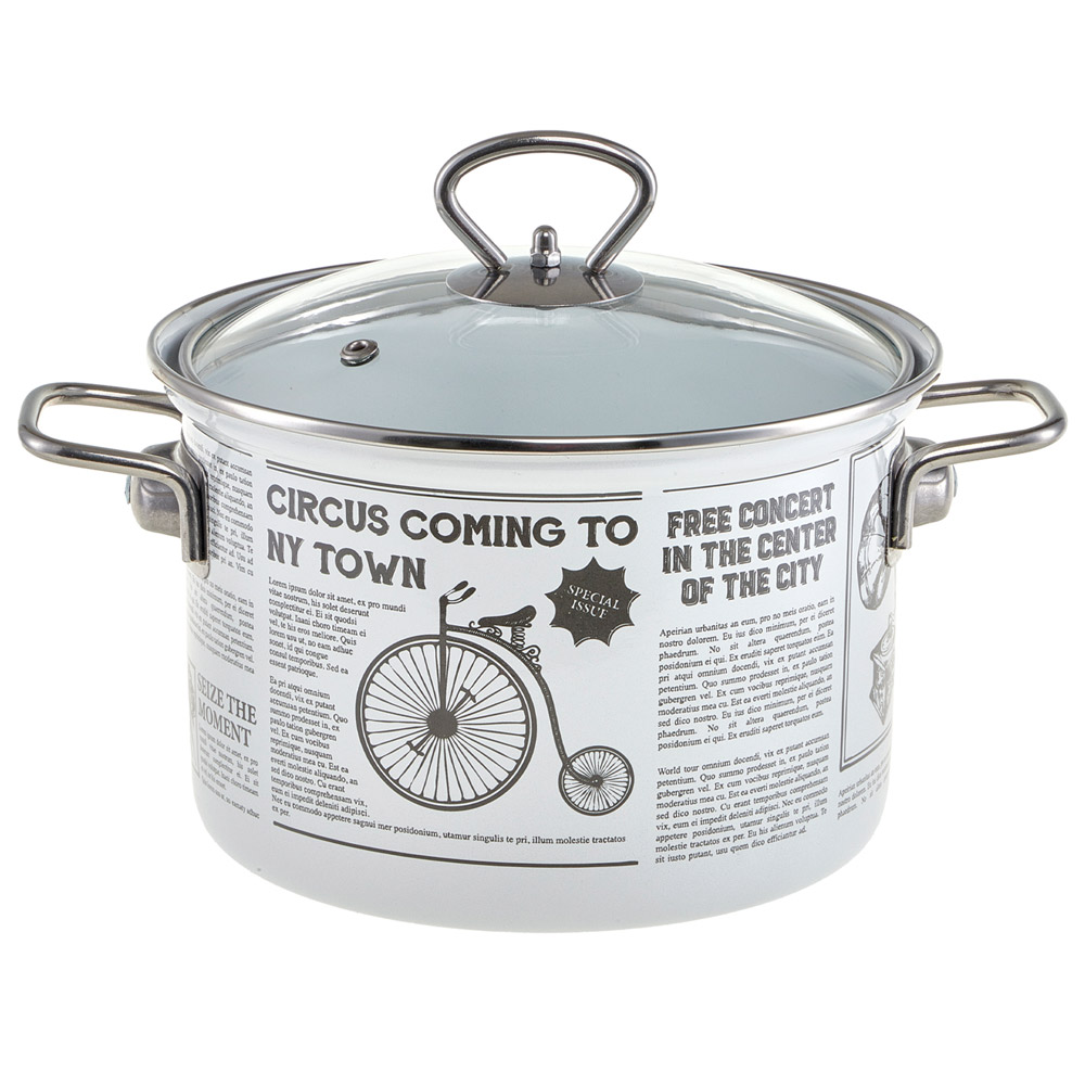 Кастрюля Hitt Newspaper 3л выполнена из высококачественной стали с эмалированным покрытием. Такое покрытие защищает сталь от коррозии, придает посуде гладкую стекловидную поверхность и надежно защищает от кислот и щелочей. Эмаль не вступает во взаимодействие с продуктами и не искажает их вкусовые качества. Кастрюля оснащена двумя удобными ручками из нержавеющей стали. Крышка из термостойкого стекла, позволит Вам следить за процессом приготовления. Она оснащена металлическим ободом и отверстием для выпуска пара. Прочный стальной корпус обеспечивает эффективную тепловую обработку пищевых продуктов и не деформируется в процессе эксплуатации. С внешней стороны кастрюля оформлена изящным рисунком.