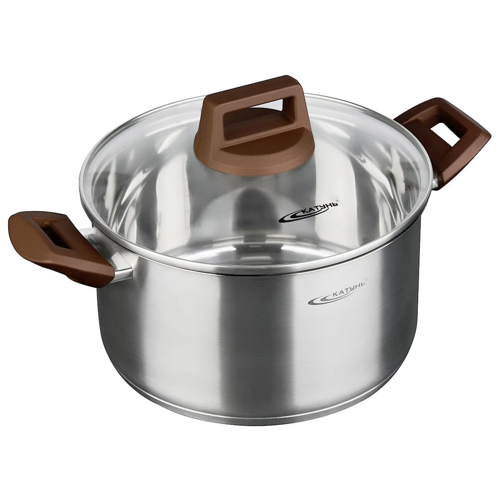 Кастрюля Катунь Венера изготовлена из нержавеющей стали без покрытия, внутри изделия нанесена мерная шкала. Ручки изготовлены из термостойкого материала с покрытием soft-touch. В комплекте с кастрюлей крышка из стекла с металлическим ободком и пароотводом, бобышка также изготовлена из термостойкого материала с покрытием soft-touch.