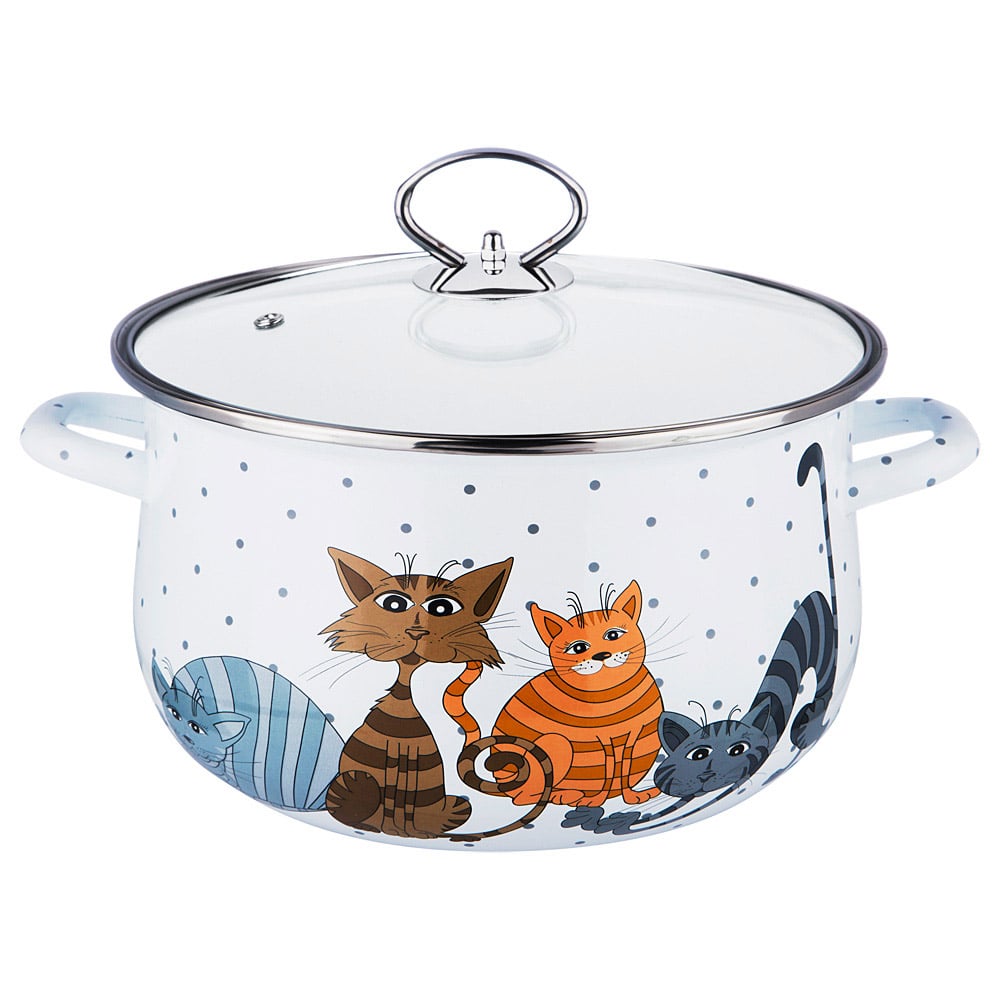 Кастрюля с крышкой "Озорные коты" выполнена из стали с эмалевым покрытием. Эмаль инертна и устойчива к пищевым кислотам, не вступает во взаимодействие с продуктами и не искажает их вкусовые качества. Внешние стенки кастрюли оформлены красочным изображением с забавными котами.