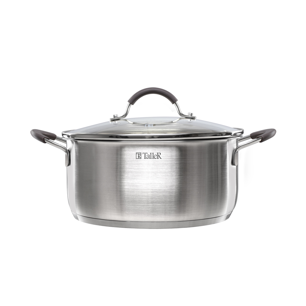 Кастрюля выполнена из нержавеющей стали 18/10. Капсулированное дно для лучшего распределения тепла. Полировка внешняя - матовая, внутренняя - матовая. Есть отметки литража. Крышка из жаропрочного стекла со стальным ободом и отверстием для выхода пара. Ручки из нержавеющей стали с силиконовой вставкой даже при намокании не выскальзывает из рук. Цвет силиконовых вставок на ручках - коричневый.
