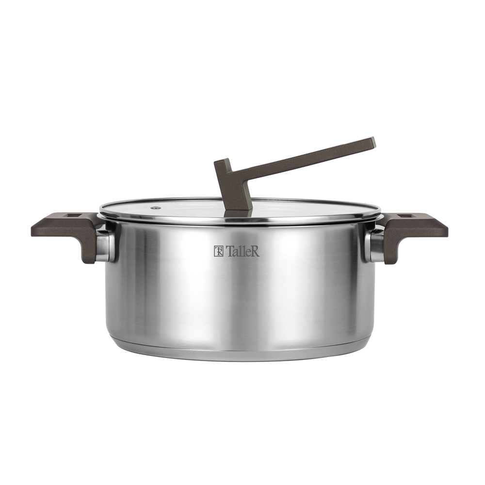 Ручки из бакелита и нержавеющей стали, крепление ручек - точечная сварка. Цвет ручек - коричневый. Материал крышки - высококачественная нержавеющая сталь и жаропрочное стекло. Крышка имеет плоское закаленное стекло и отверстие для выхода пара. Уникальная конструкции ручки позволяет установить крышку на кастрюлю во время приготовления пищи.