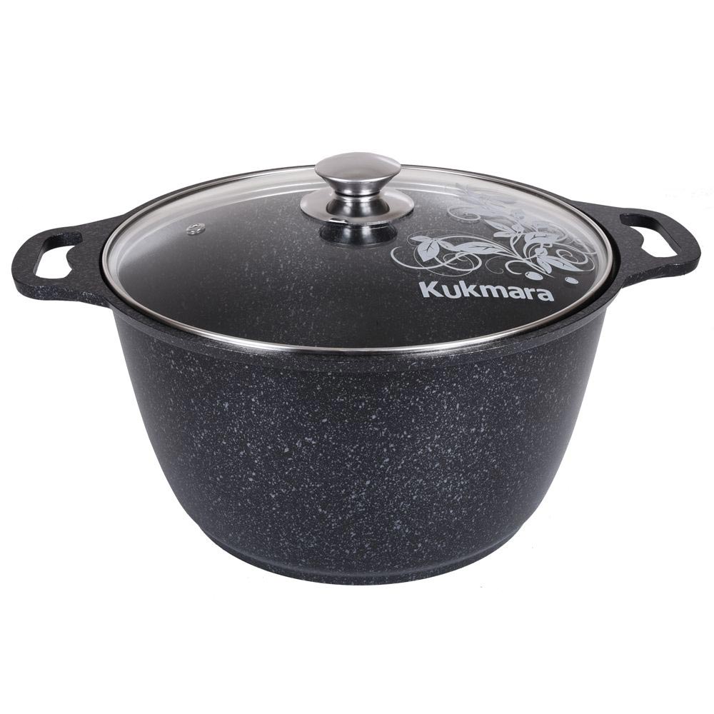 Кастрюля изготовлена из литого алюминия и покрыта инновационным антипригарным мраморным покрытием нового поколения на водной основе, усиленным сверхтвердыми частицами минералов, фирмы "Weilburger Coatings GmbH" (Германия).