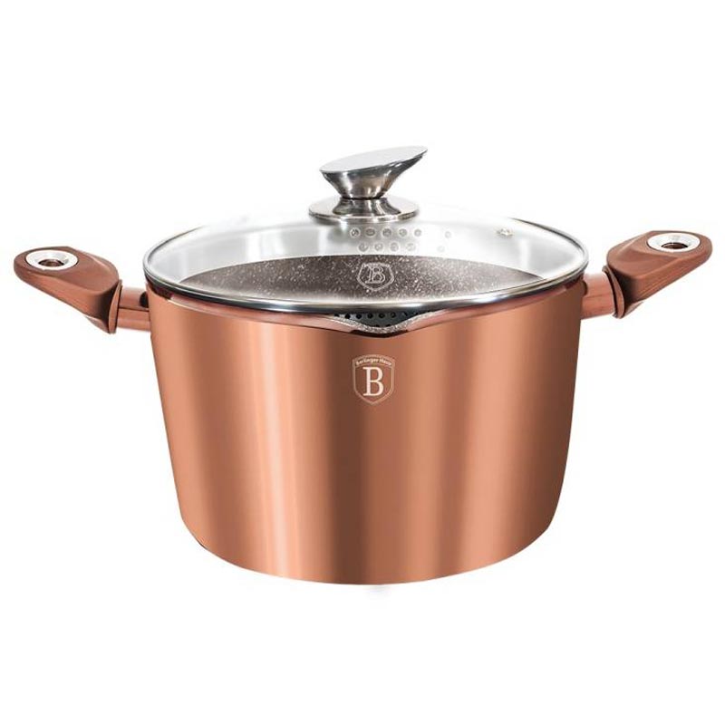Кастрюля "Rosegold Line"изготовлена из кованого алюминия с трехслойным мраморным покрытием.
