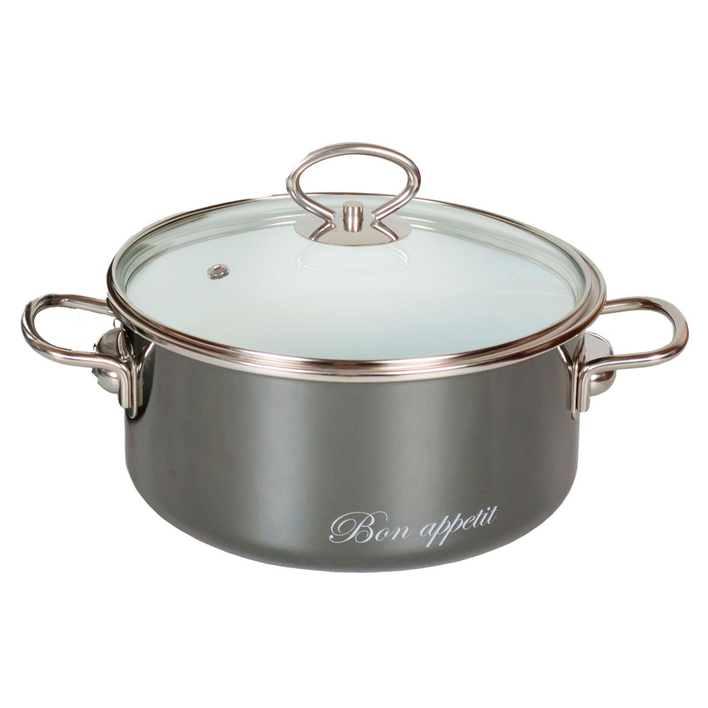 Внутренняя поверхность изделия - белого цвета, внешняя - глянцевого серого цвета. Кастрюля оснащена стеклянной крышкой с металлическим ободом и пароотводом, а также удобными стальными ручками.