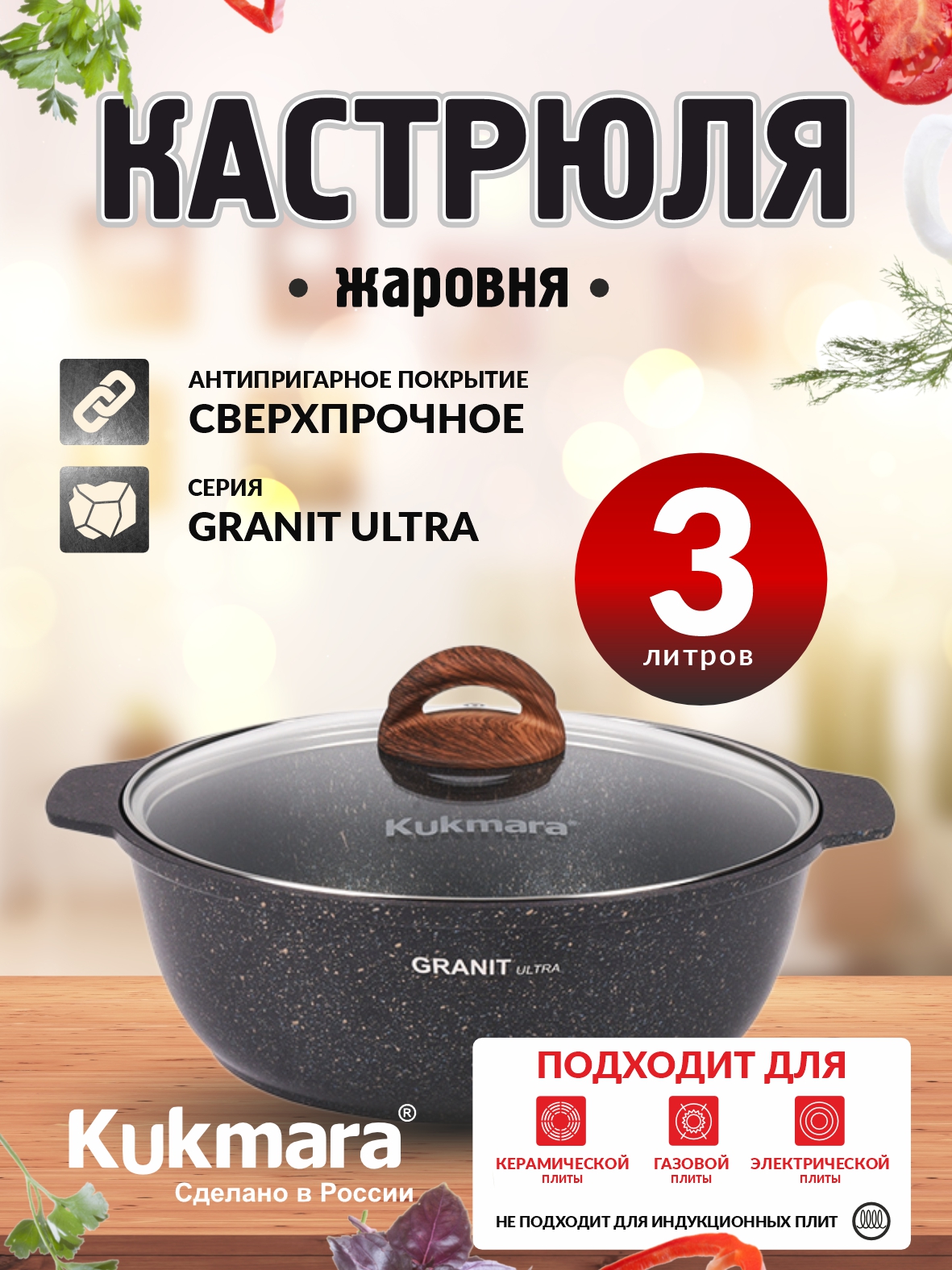 Кастрюля-жаровня "Kukmara" изготовлена из литого алюминия и покрыта уникальным ультрапрочным антипригарным покрытием «Ultra granit».