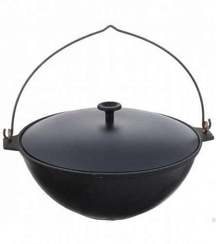 Казан имеет чугунные ручки и одну подвесную из углеродистой стали.