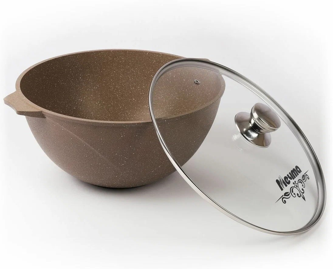 Казан – это специфическая посуда, которая является незаменимой на кухне. В нем можно приготовить много интересных блюд: наваристые супы, соусы, тушеное мясо и десерты. Главным кулинарным творением, для создания которого необходим казан, является плов. Ну а если говорить о пикниках, выездах на природу и рыбалку, то здесь никак не обойтись без качественного казана. Серия Гранит — это литая алюминиевая посуда с антипригарным покрытием повышенной стойкости, с содержанием частиц твердых минералов.
