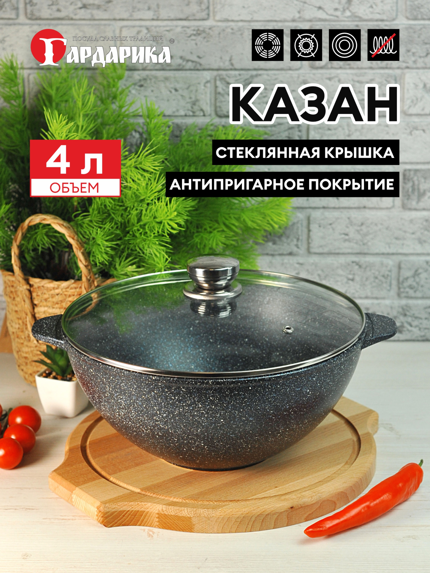 Казан "Мегалит" предназначен для приготовления плова и других блюд, требующих равномерного прогрева и длительного томления. Подходит для газовых, электрических, стеклокерамических плит и духового шкафа.