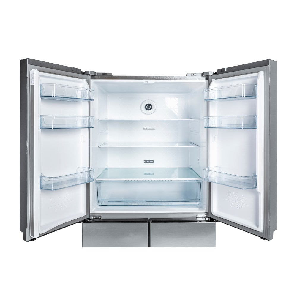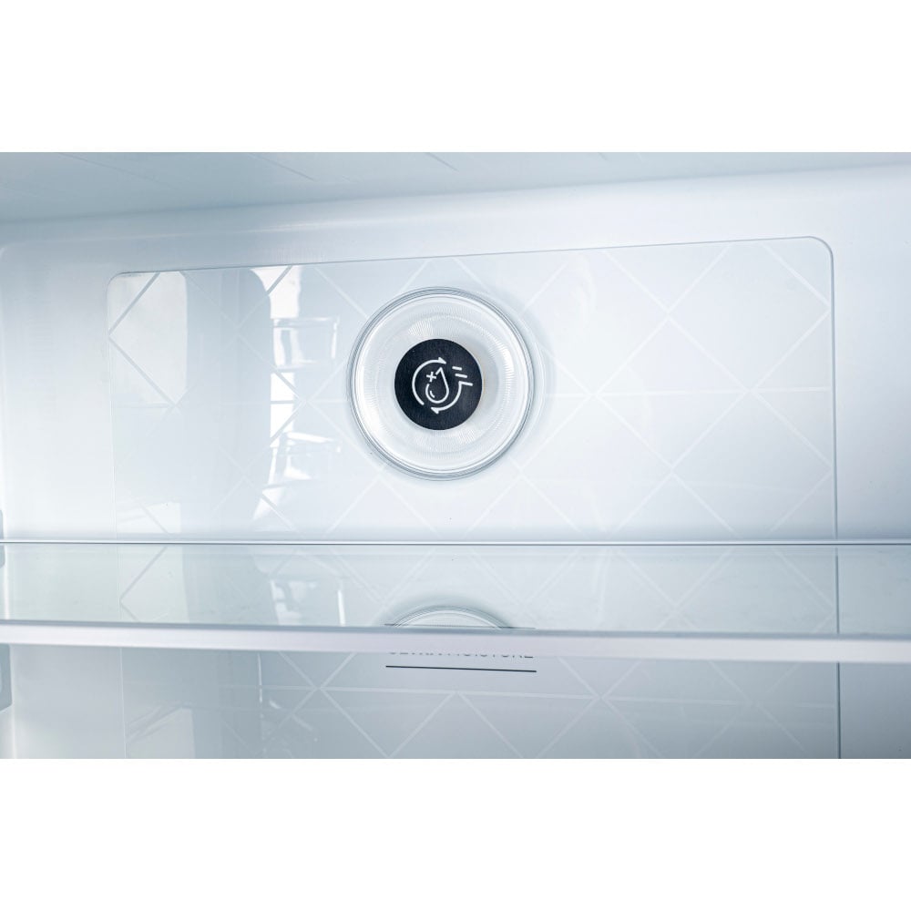 В холодильнике реализована технология No Frost. Благодаря этому модель не нуждается в разморозке, что упрощает эксплуатацию. На одной из дверей размещен дисплей с индикацией температуры.