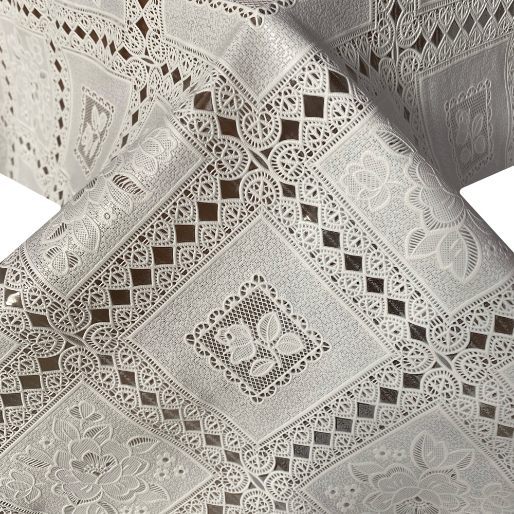 Качественная столовая клеенка ажурная без основы в упаковке. Клеенка однотонная из мягкого ПВХ с вырубкой. Плотность клеенки высокая 350г на м2.