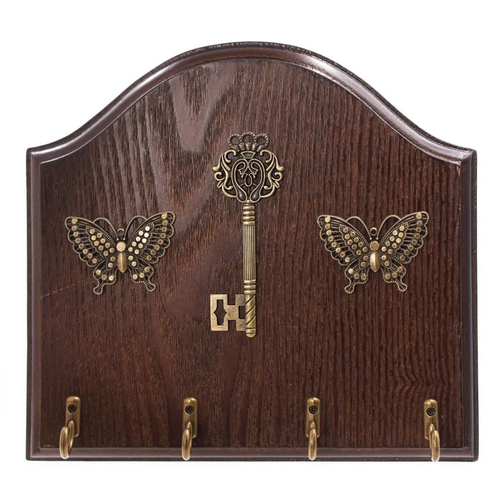 Ключница открытая фигурная для 4-х ключей изготовлена из дерева. Декор - металлический ключ и две бабочки. Крепится на стену с помощью металлической петли. Упакована в картонную коробку.