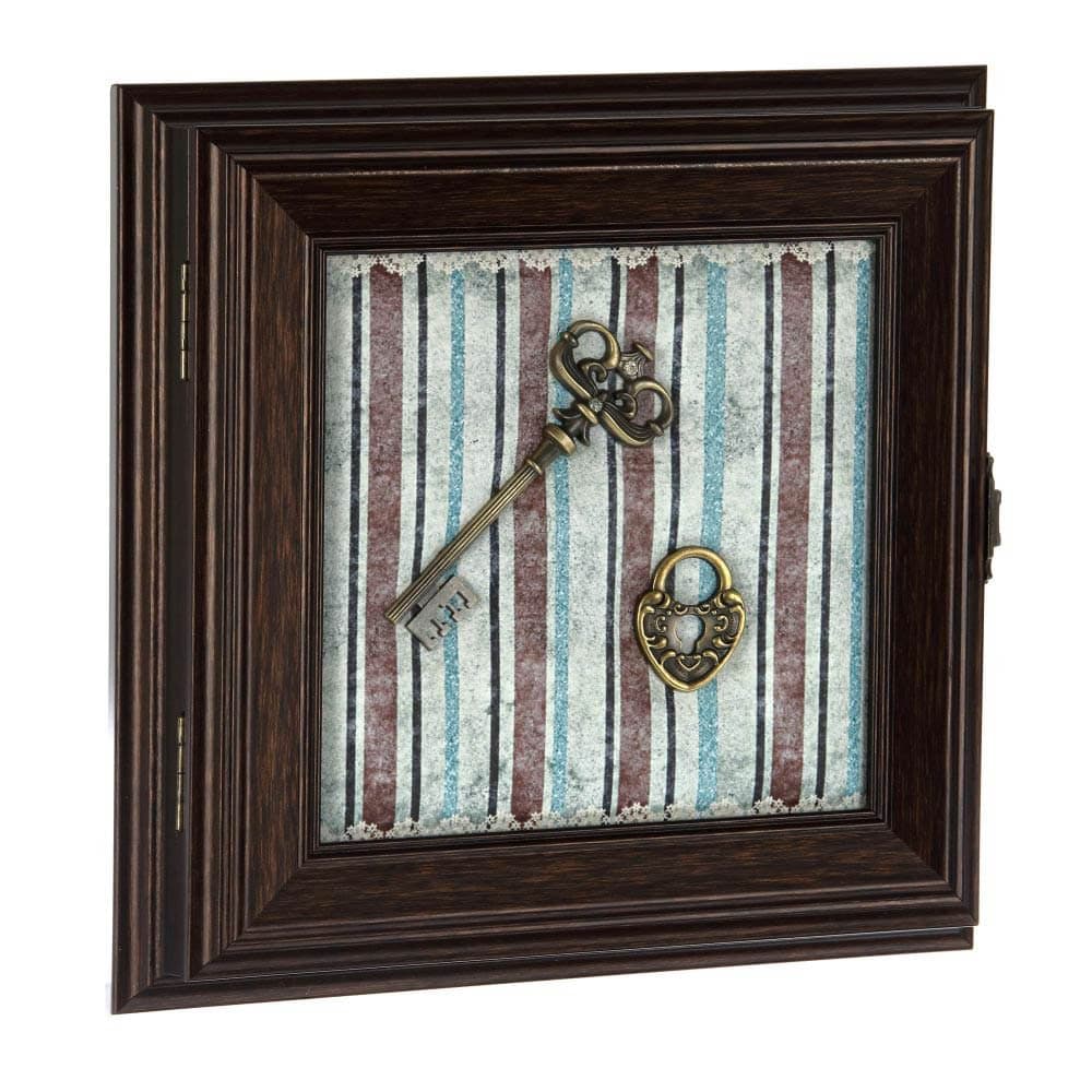 Ключница закрытая для 5 ключей изготовлена из пластика. Цвет корпуса коричневый. Печать фото-коллаж "Ключ" на ПВХ пленку с мягкой подложкой. Внутри отделана тканью под бархат. Прикрепите ее на удобное место в прихожей, и Ваши ключи всегда будут под рукой.