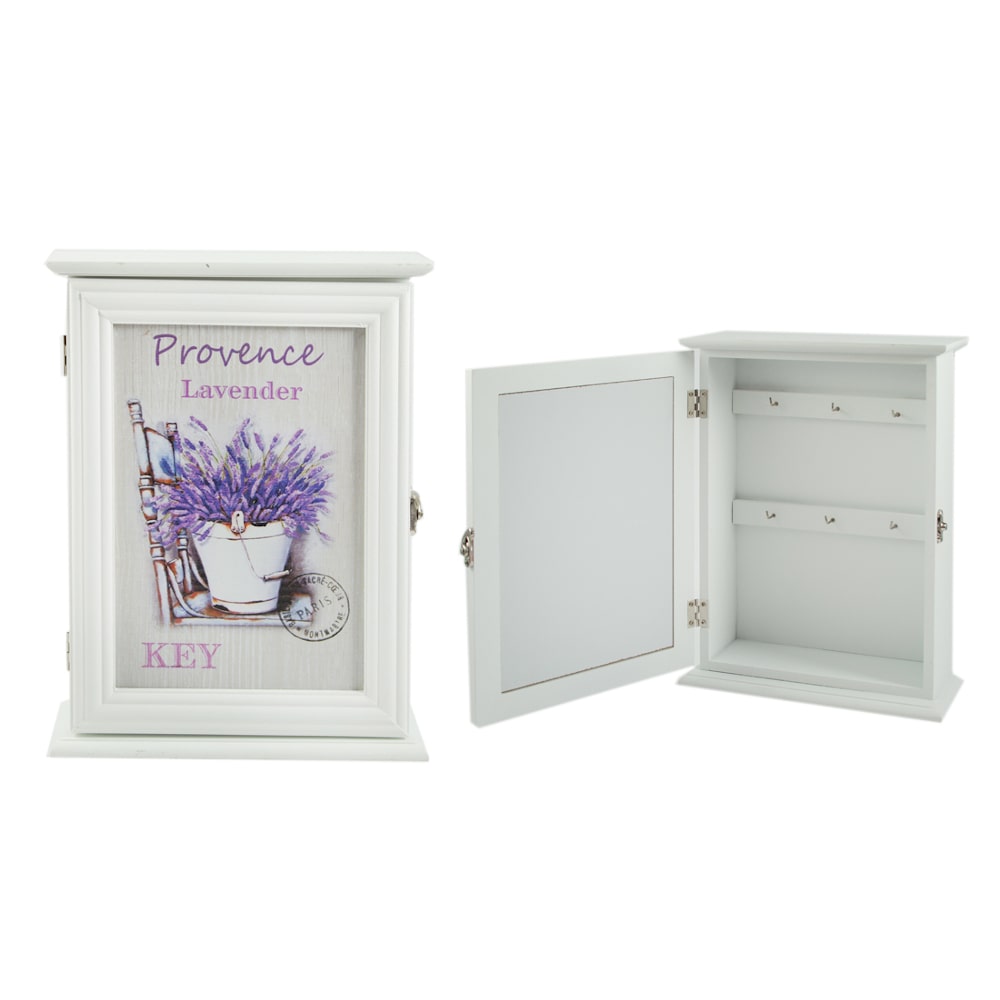 Ключница "Прованс" закрытая для 6 ключей изготовлена из дерева и металла. Цвет корпуса белый. Рисунок нанесен на полимерную пленку. Закрывается на металлический крючок. Крепится на стену с помощью 2-х металлических петель.