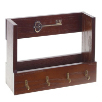 Ключница с карманом для мелочей имеет четыре металлических крючка, изготовлена из дерева и декорирована фигурным ключом.