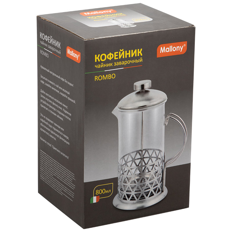 Френч-пресс "Rombo" объемом 800 мл предназначен для заваривания чая, кофе и других напитков. Его коэффициент линейного расширения составляет 3,0. Изделие изготовлено из высококачественных материалов: корпус, фильтр и стержень выполнены из нержавеющей стали марки № 201, а колба — из жаропрочного боросиликатного стекла. Крышка комбинированная, из нержавеющей стали № 201 и пластмассы. Толщина стеклянной колбы равна 2 мм, а толщина нержавеющей стали — 0,3 мм. В уходе за прессом важно помнить, что в посудомоечной машине допускается мыть только стеклянную колбу. Остальные части не рекомендуется мыть в посудомоечной машине; их следует очищать мягким моющим средством и теплой водой с последующим тщательным просушиванием. Изделие поставляется в цветной картонной коробке с дополнительной защитой пузырчатой пленкой.
