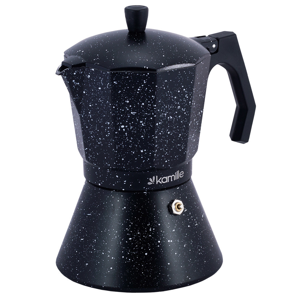Гейзерная кофеварка Kamille создана для приготовления великолепного кофе по современным итальянским технологиям. Используя ее на любых кухонных плитах, за считанные минуты Вы сможете насладиться чашкой ароматного, хорошо проваренного кофе. Гейзерная кофеварка 600 мл. Kamille KM-2514MR индукция черный мрамор Материал: алюминий Материал ручки: бакелит Объем: 600 мл. Количество порций: 12. Особенности: мраморное покрытие, широкое индукционное дно. Использование: Наполните нижнюю емкость водой, поместите сверху емкость-фильтр и наполните ее молотым кофе, не утрамбовывая его. Наденьте верхнюю секцию и прокрутите для закрытия. Убедитесь, что фильтр и силиконовое кольцо на месте и плотно прилегают друг к другу. Обратите внимание, что очень важно обеспечить таким образом полную герметичность. При приготовлении кофе уровень нагревания должен быть низким! Когда кофе перестанет поступать в верхнюю емкость, кофеварку необходимо убрать с нагревающей поверхности. Ароматный горячий кофе готов. Уход: После остывания кофеварки рекомендуется сразу раскрутить и вымыть ее при помощи небольшого количества моющего средства. Производить сборку только в сухом виде!