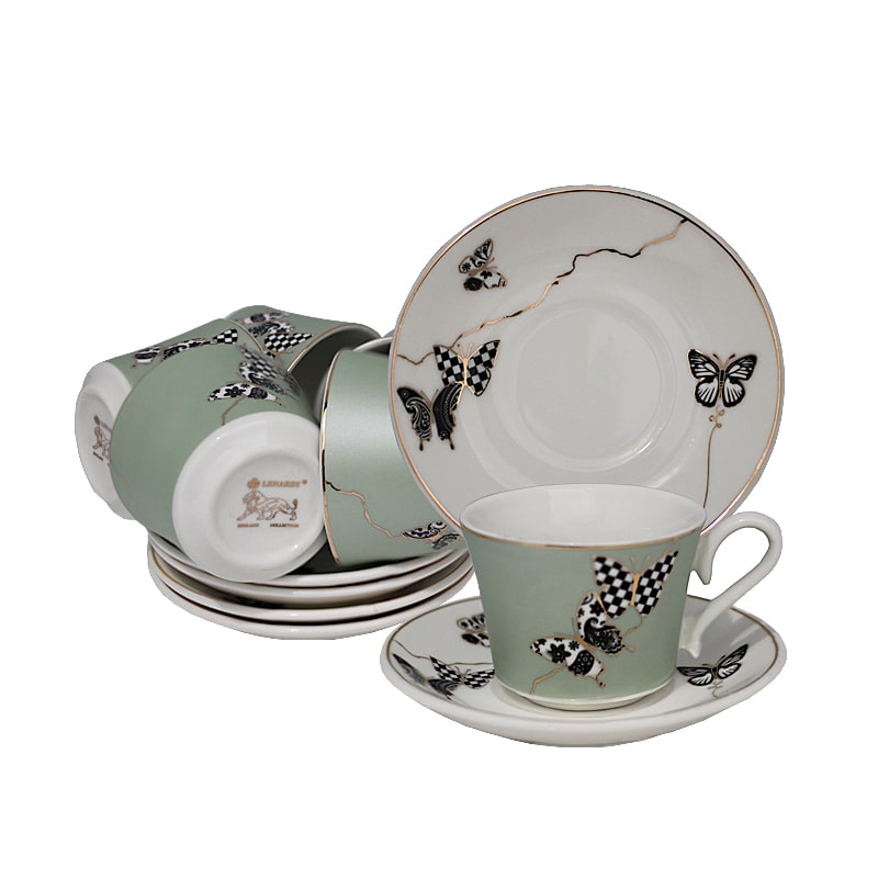 Кофейный сервиз Lenardi Butterfly изготовлен из высококачественного фарфора с глазурованным покрытием, декорирована красивым рисунком бабочки. Рассчитан на 6 персон. В комплекте 6 чашек объемом 80 мл и 6 блюдец.