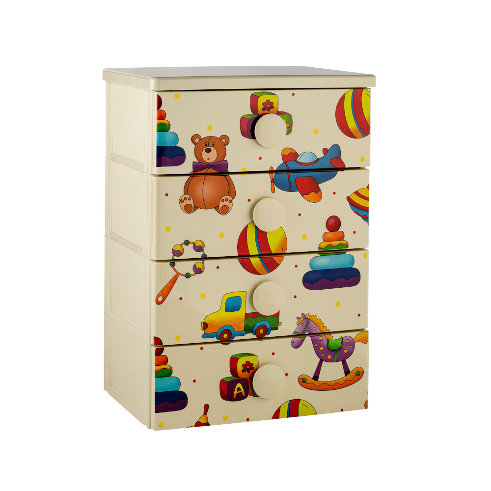 Комод, цельнолитой на 4 ящика, изготовлен из экологически безопасного полипропилена. Изделие можно использовать в помещениях с повышенной влажностью и на балконе.