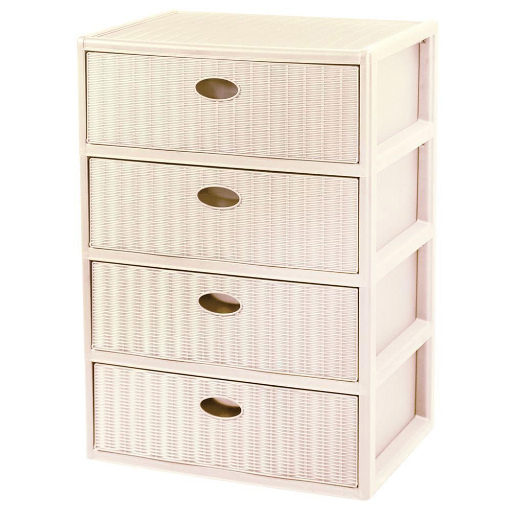 Стильный дизайн создается имитацией плетенки на панелях ящиков и корпусе.