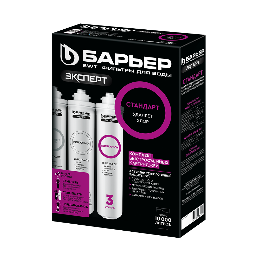 Комплект сменных картриджей "Барьер EXPERT Standard" предназначен для доочистки питьевой водопроводной воды в составе проточного водоочистителя "Барьер EXPERT Standard".