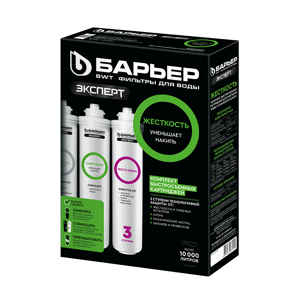 Комплект сменных картриджей "Барьер EXPERT Hard" предназначен для доочистки питьевой водопроводной воды в составе проточного водоочистителя "Барьер EXPERT Hard".