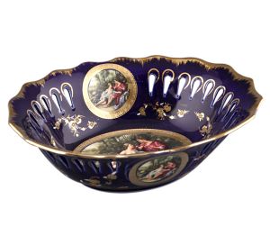 Темно-синий оттенок прекрасно гармонирует с золотистым узором. Такое блюдо станет великолепным украшением интерьера кухни и гостиной.