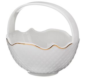 Конфетница оформлена в виде милой корзинки с ручкой. Она делает сервировку более удобной. Высокие бортики предотвращают соскальзывание пищи.