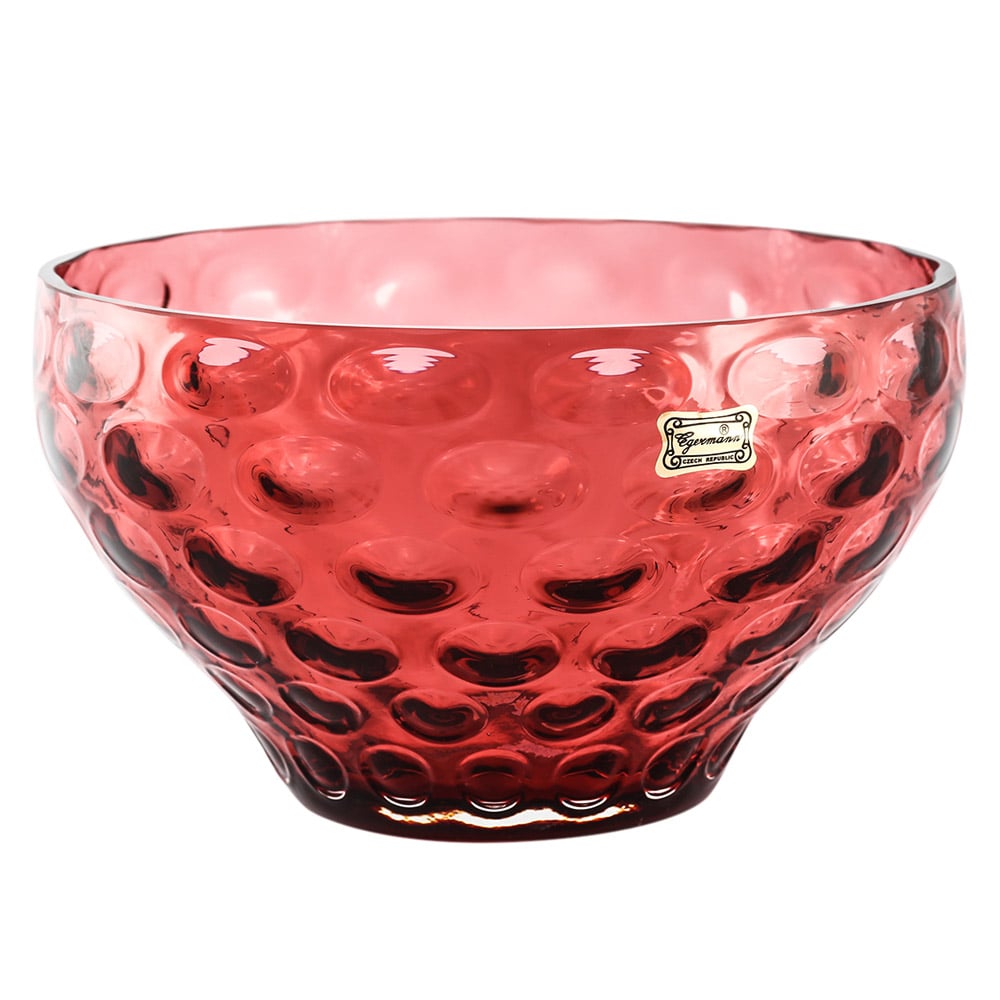 Вазочка сделана из красного стекла с вогнутыми кругами (как соты). Диаметр 20 см.