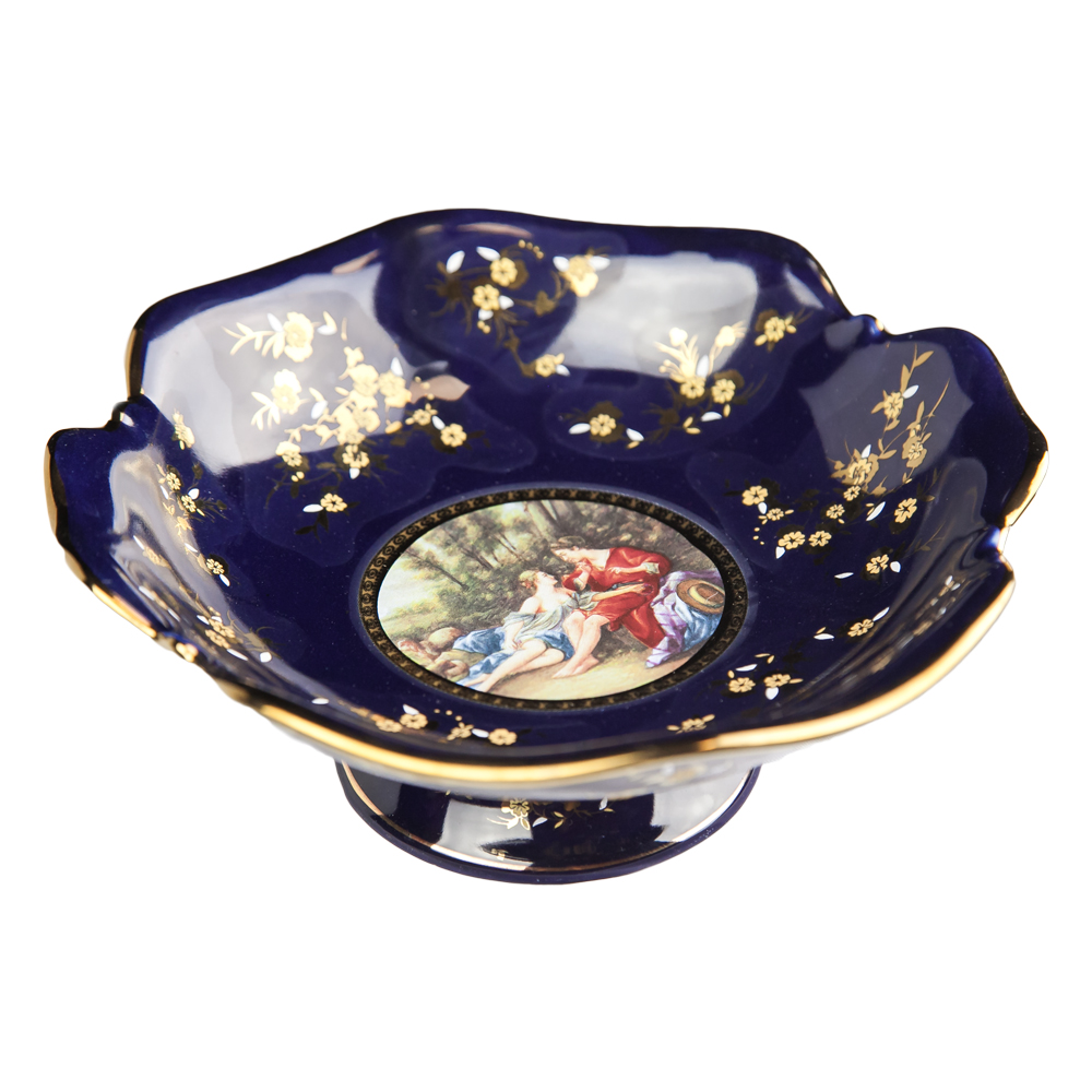 Темно-синий оттенок прекрасно гармонирует с золотистым узором. Такое блюдо станет великолепным украшением интерьера кухни и гостиной.